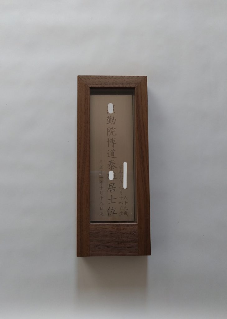「燃えない位牌」ステンレス板に戒名を刻印、無垢材の木工フレームに収納して、壁に掛けて