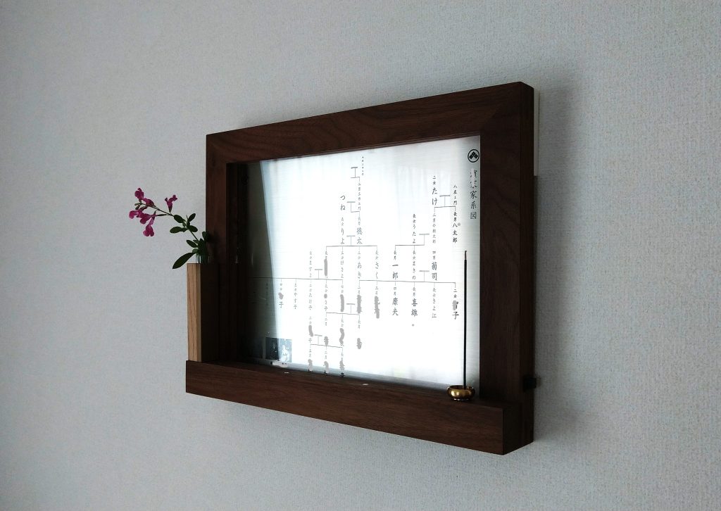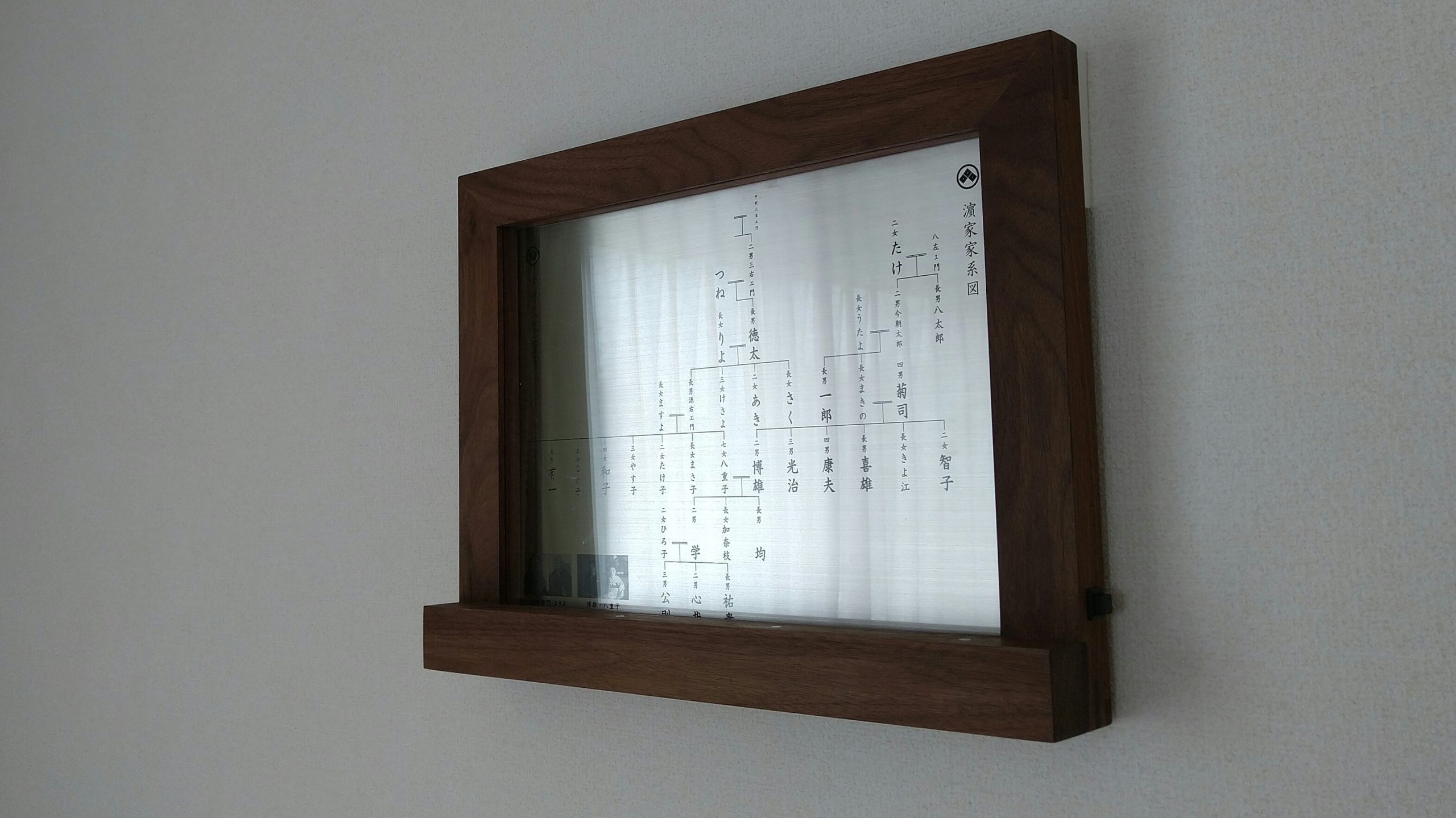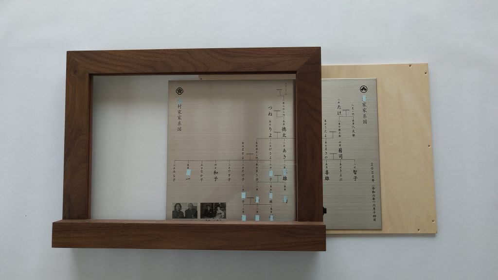 ステンレスプレートに家系図を刻印して、ウォールナットのフレームに納め、身近な壁に掛けられる装飾品を作りました。