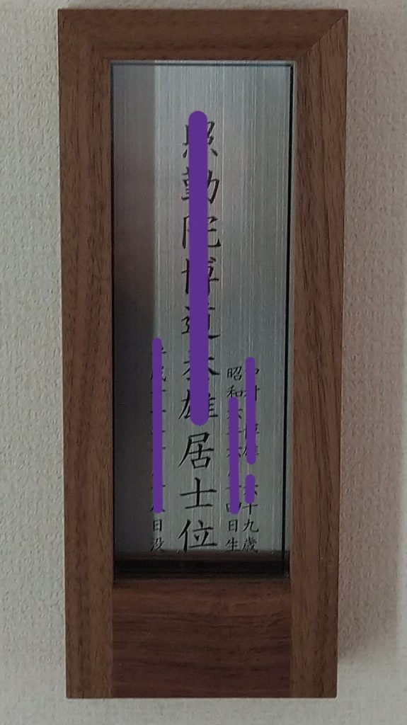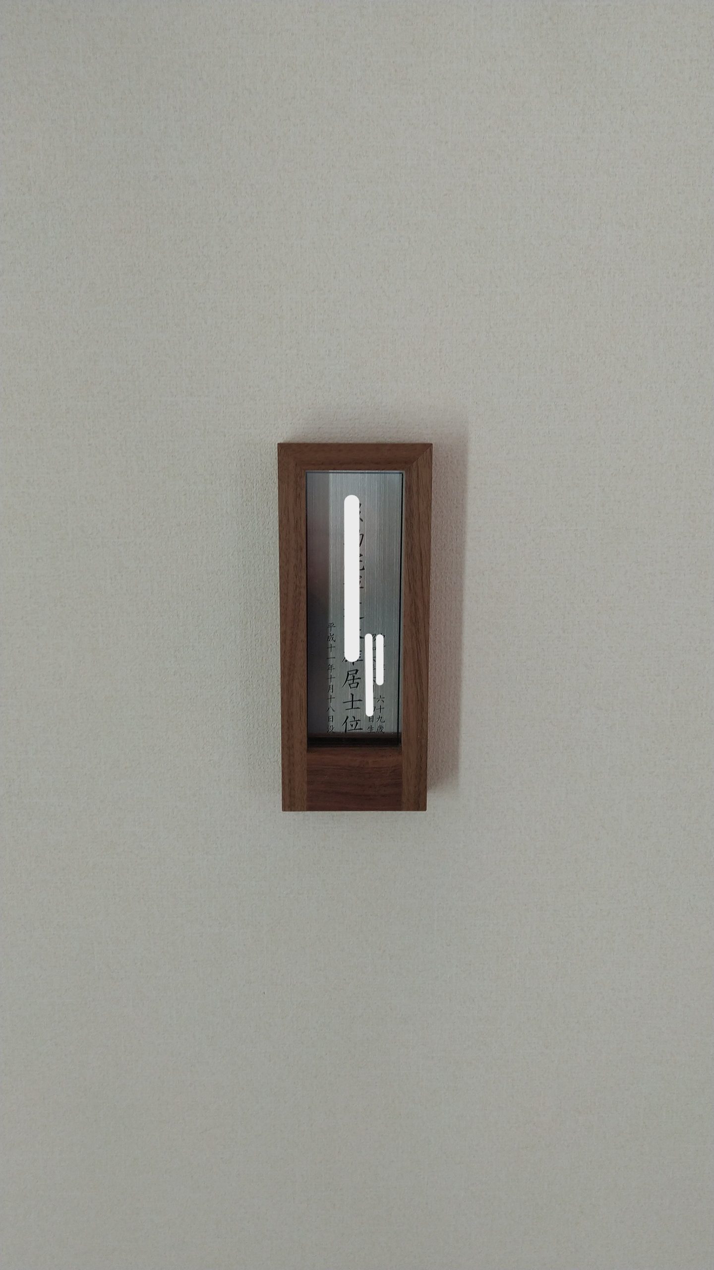 金属プレートに戒名を刻印、今回は名前・生年月日・他界年などの大切な文言も表面に刻印して、無垢材フレームに納めた壁掛けタイプに仕上げました。